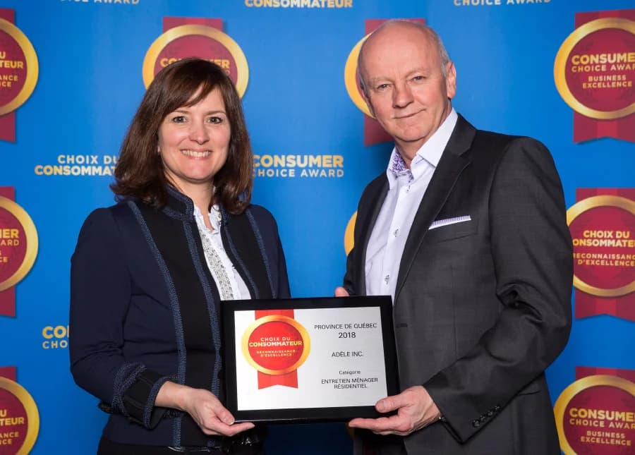 The President of Consumers Choice Awards Canada personally presents Julie Bergevin and Gaétan Migneault with another plaque for Adèle, Consumers Choice, in the “Residential Cleaning Services” category.